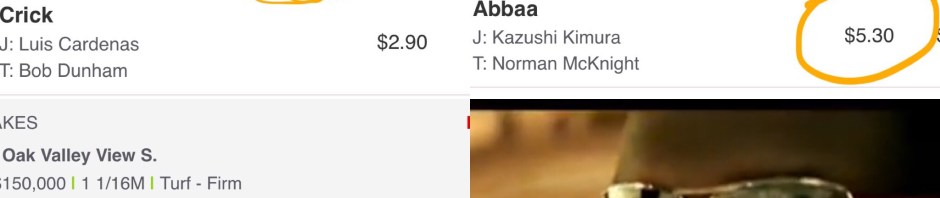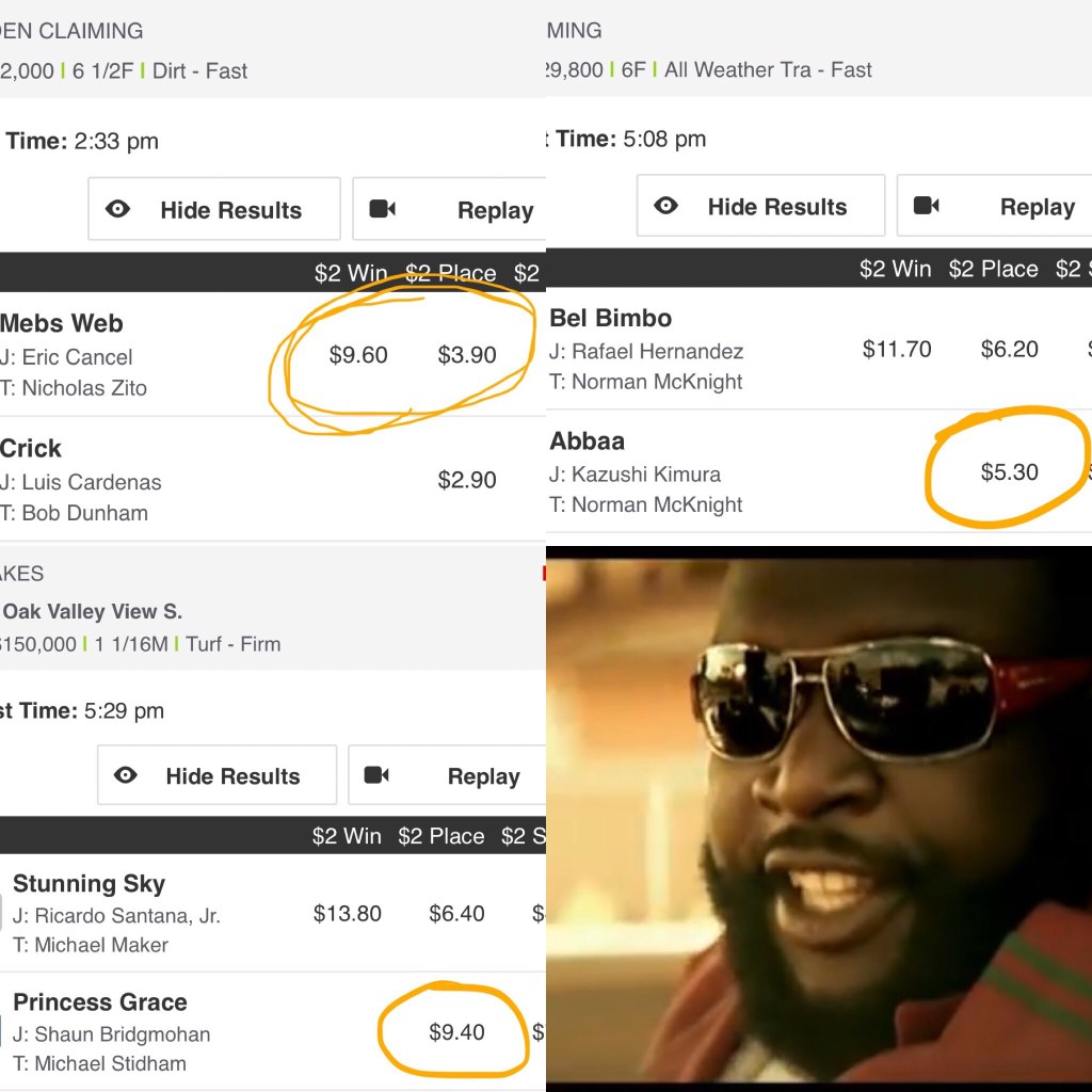 At any rate, I paid a few bills with the tickets today, and its showing the benefits of cleaning up my play back list. I’m looking to really step up my base wagers when the time is right – just trying to get to a point where I’m able to play a bit more day to day than I have the past couple of weeks. The black book probably has about 100 plays waiting to be had, and today was just evidence that it can be done. Six possible plays tomorrow. Let’s cash them !